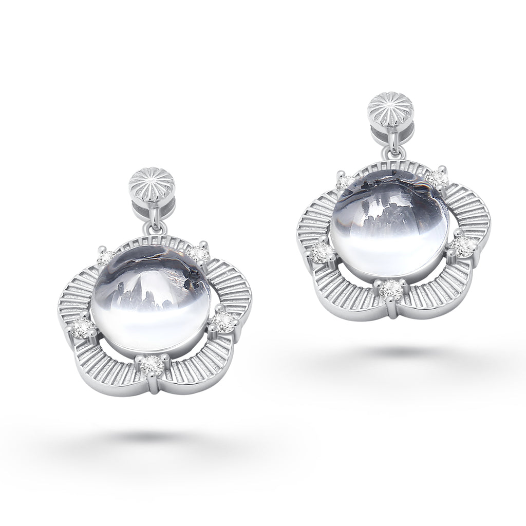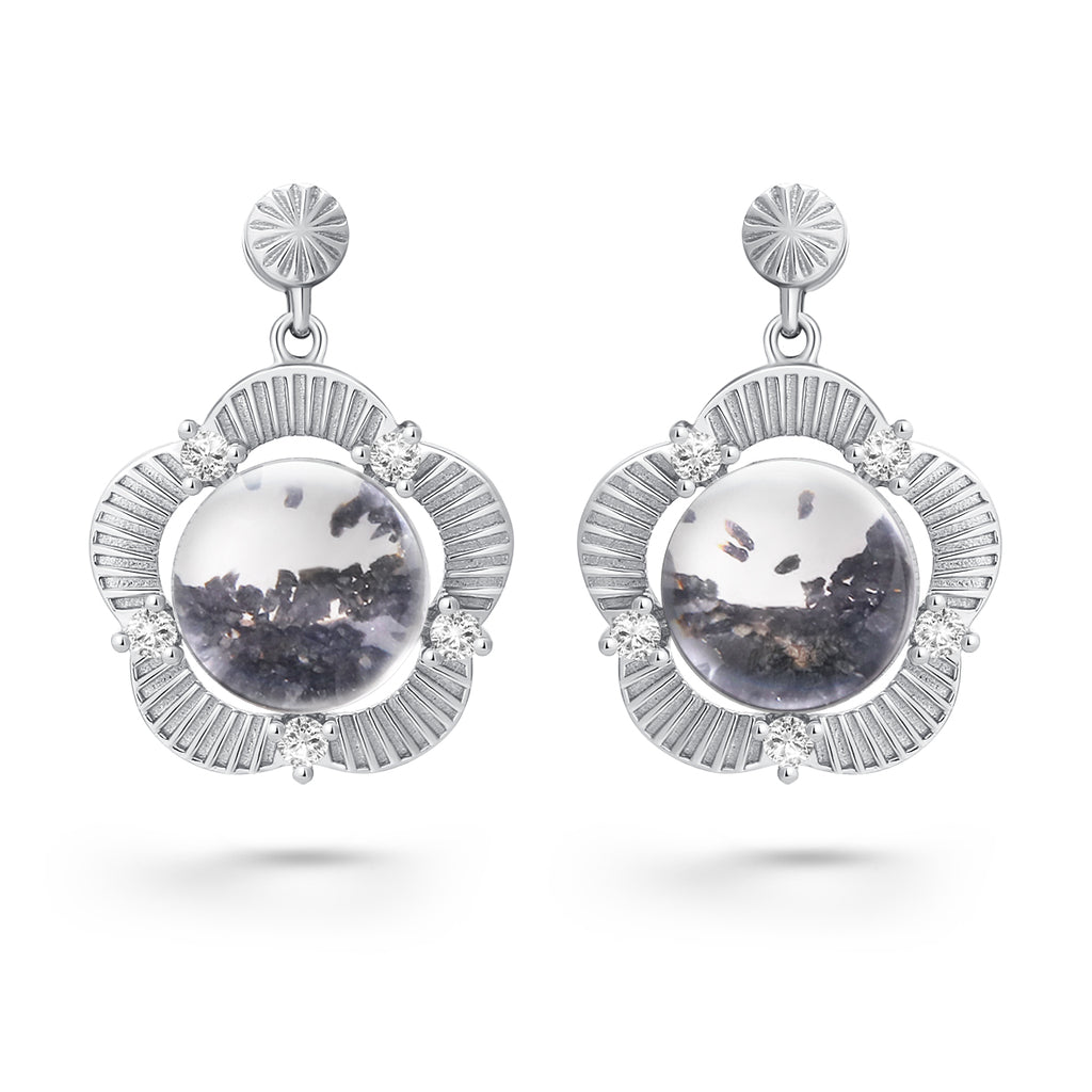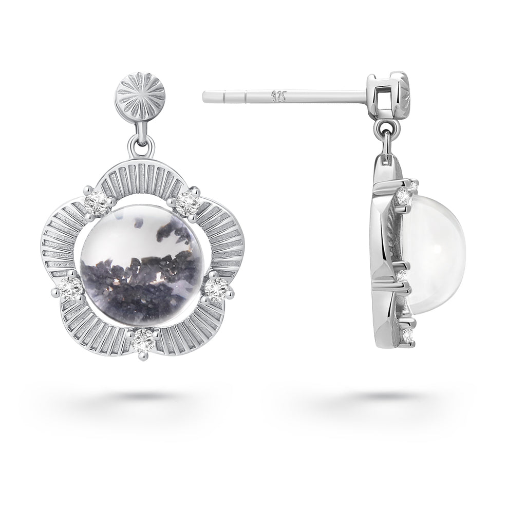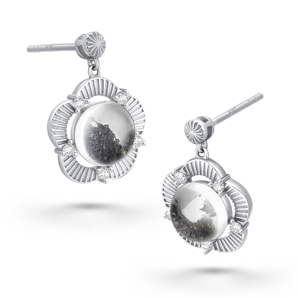 These lovely handmade earrings are crafted with sterling silver and adorned with moissanite. They contain approximately 10mg of lunar stone fragments from lunar meteorite NWA 11788. The lunar fragments are covered by a pure crystal glass stone. The crystal stone is shaped in a way as to magnify the magical contents.