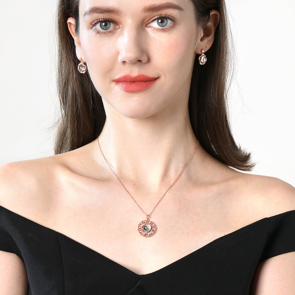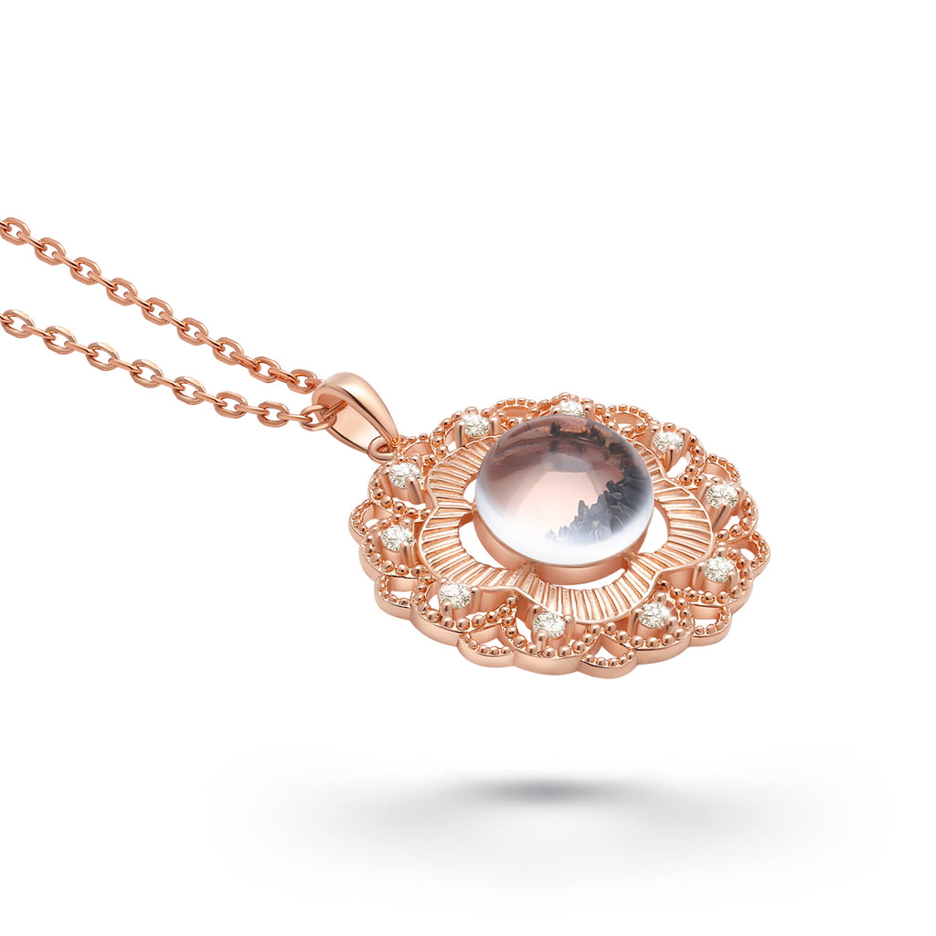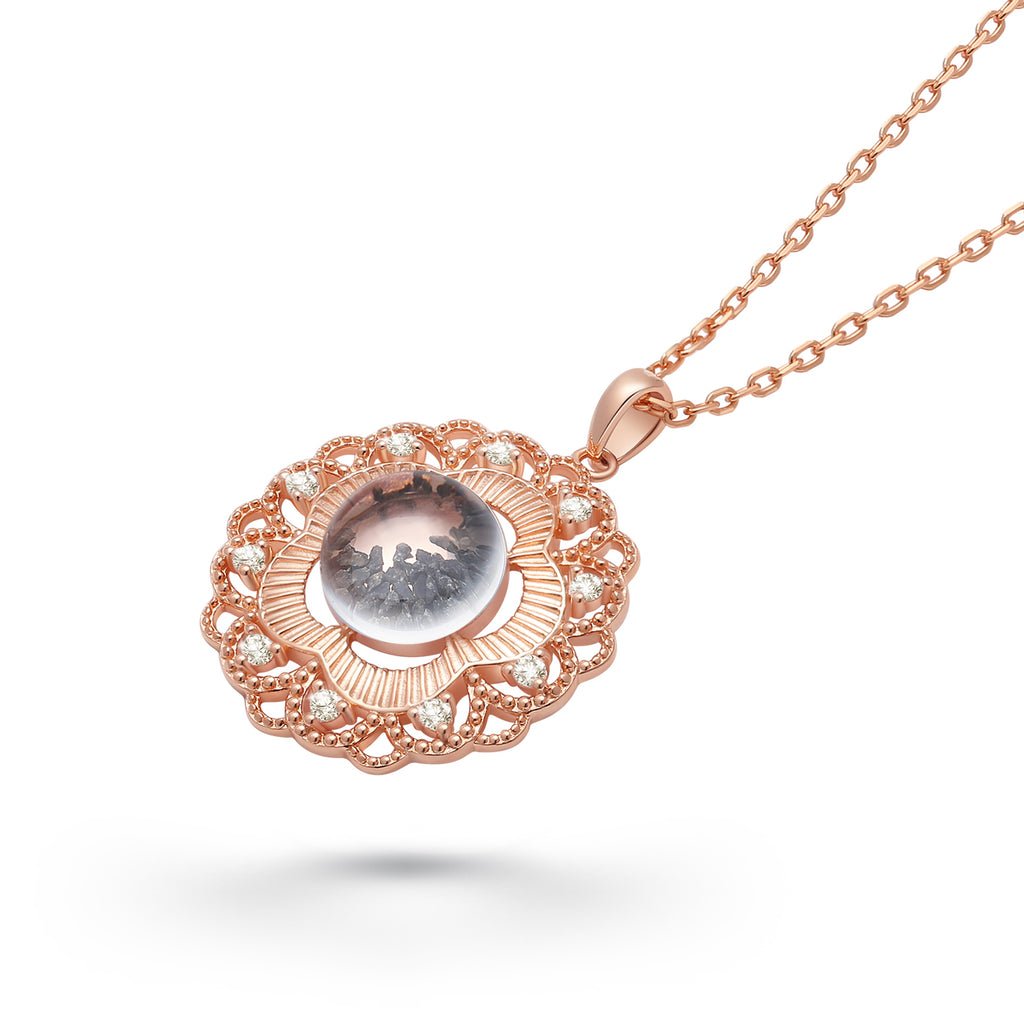 This lovely handmade necklace is crafted with sterling silver, plated with 18K rose gold, and adorned with moissanite. The pendant contains approximately 10mg of Moon dust from lunar meteorite NWA 5000. The Moon dust covered by a pure crystal glass stone. The crystal stone is shaped in a way as to magnify the magical contents.