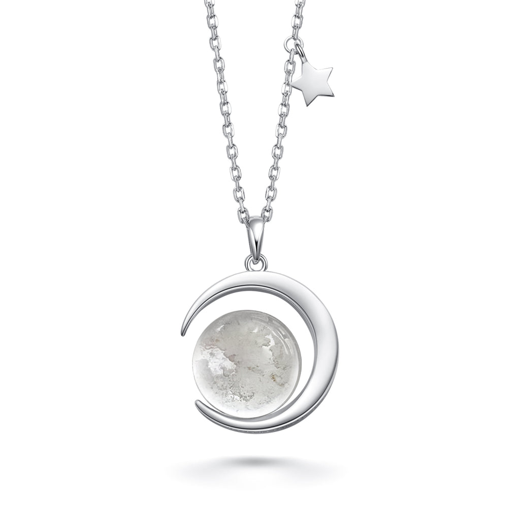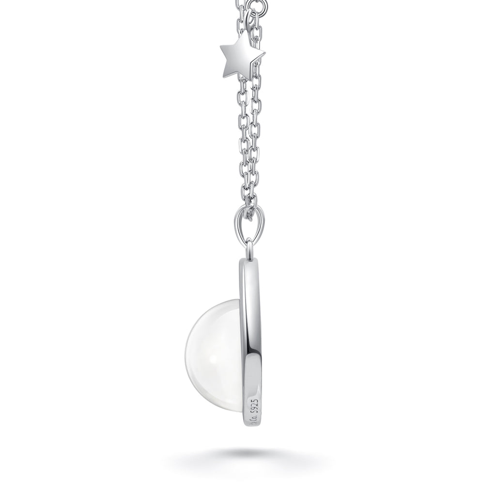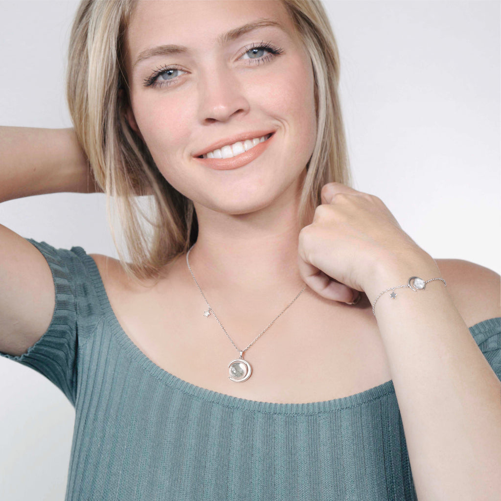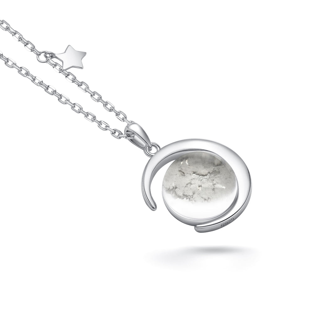 This lovely handmade necklace is crafted with sterling silver. The pendant contains approximately 10mg of Moon dust from lunar meteorite NWA 5000. The Moon dust covered by a pure crystal glass stone. The crystal stone is shaped in a way as to magnify the magical contents.