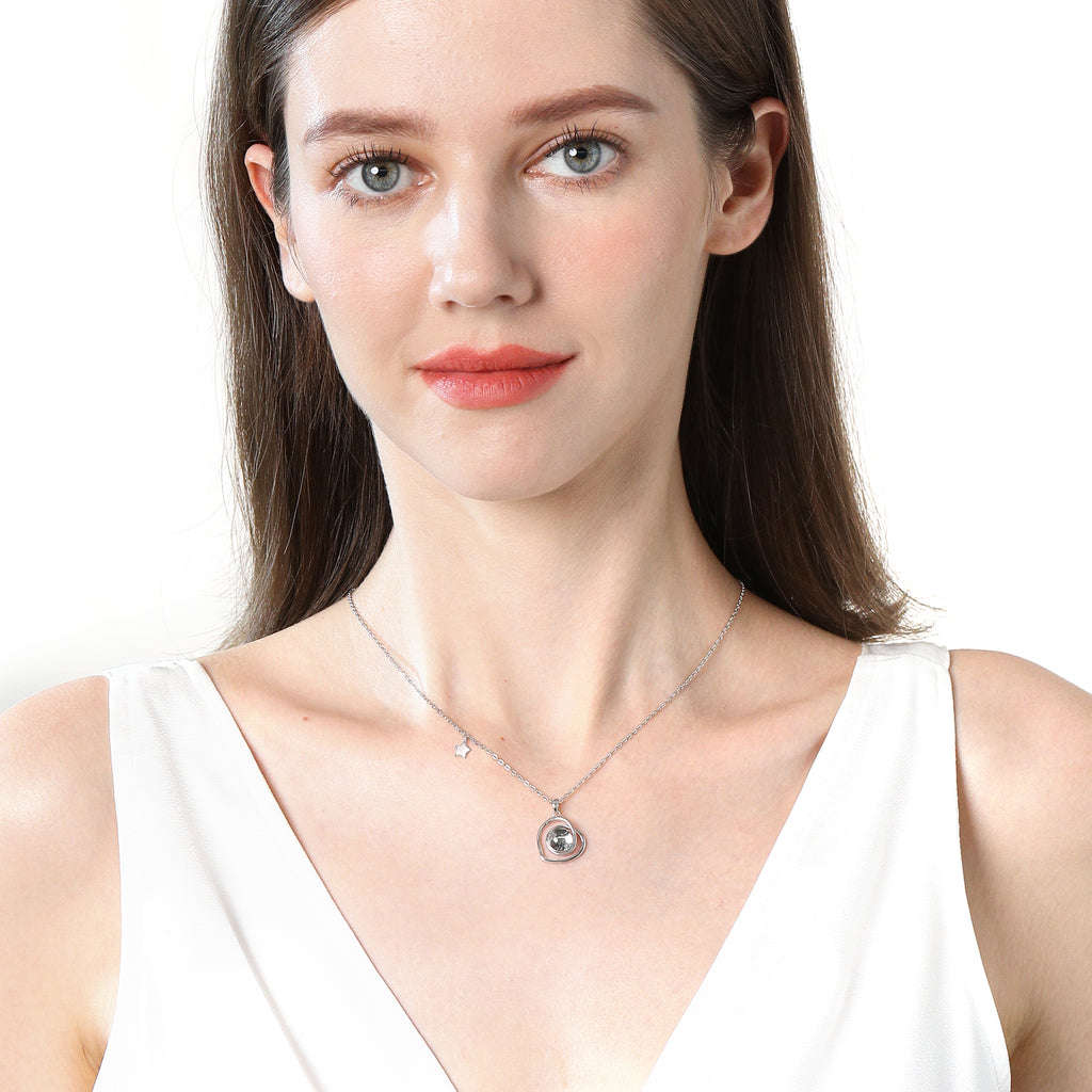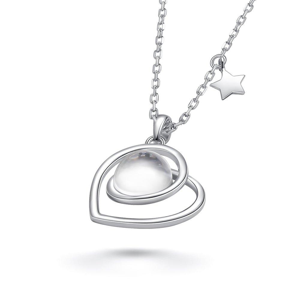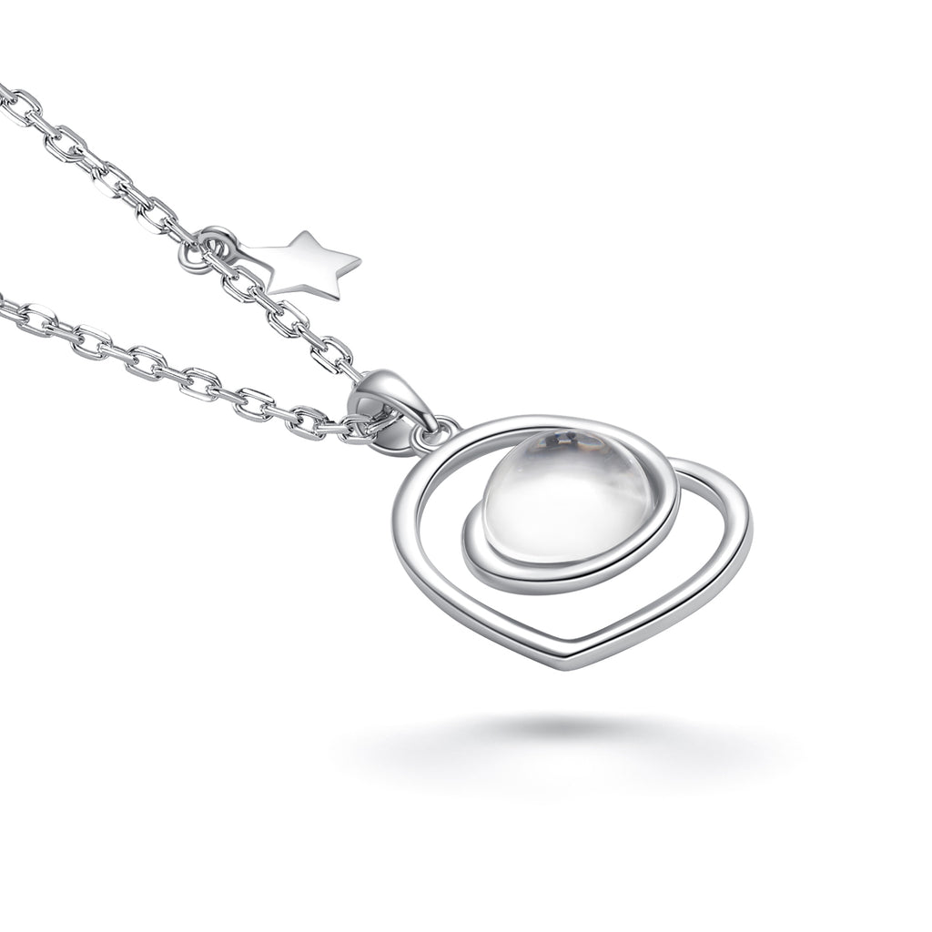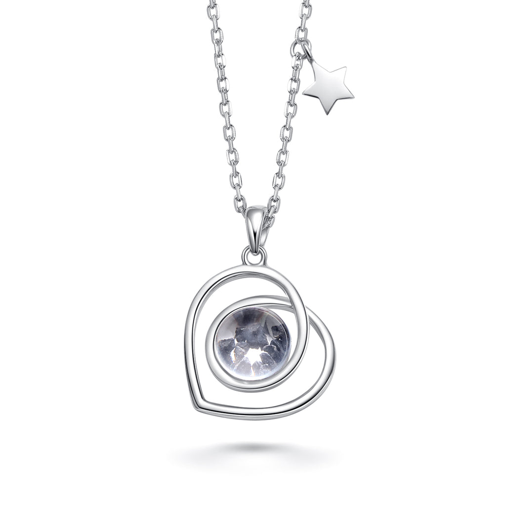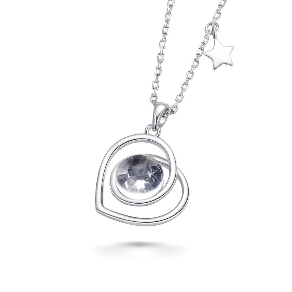 This lovely handmade necklace is crafted with sterling silver. The pendant contains approximately 10mg of lunar stone fragments from lunar meteorite NWA 11788. The lunar fragments are covered by a pure crystal glass stone. The crystal stone is shaped in a way as to magnify the magical contents.